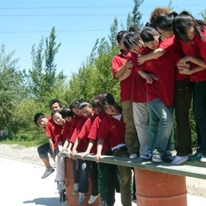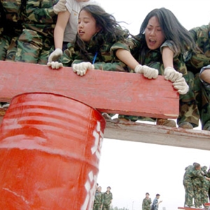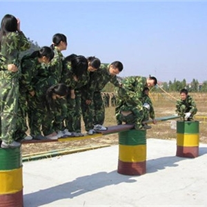 项目简介全体队员面前有两块木板、三个铁桶。要求学员在40分钟内,站在两块木板上利用三个铁桶前行20米。在此过程中队员不得把木板落地,不能把桶放倒。