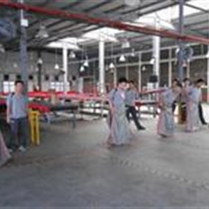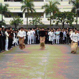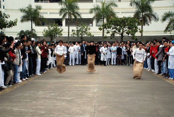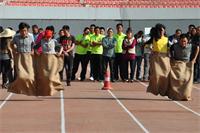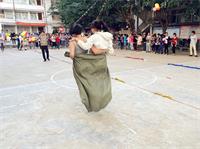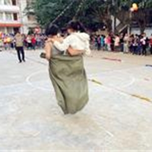 每组比赛四队参加,每队10人,全部由男生组成。每支队伍平均分为2个小队记为A,B,相向各排成一纵队。比赛开始前,每组A队的第一名队员将布袋套至腰部,听裁判员发令后向B队前进,中途布袋不得脱离双腿,至B队时脱去布袋,由B队队员套上布袋向A队前进,如上述循环直至最后一名队员。